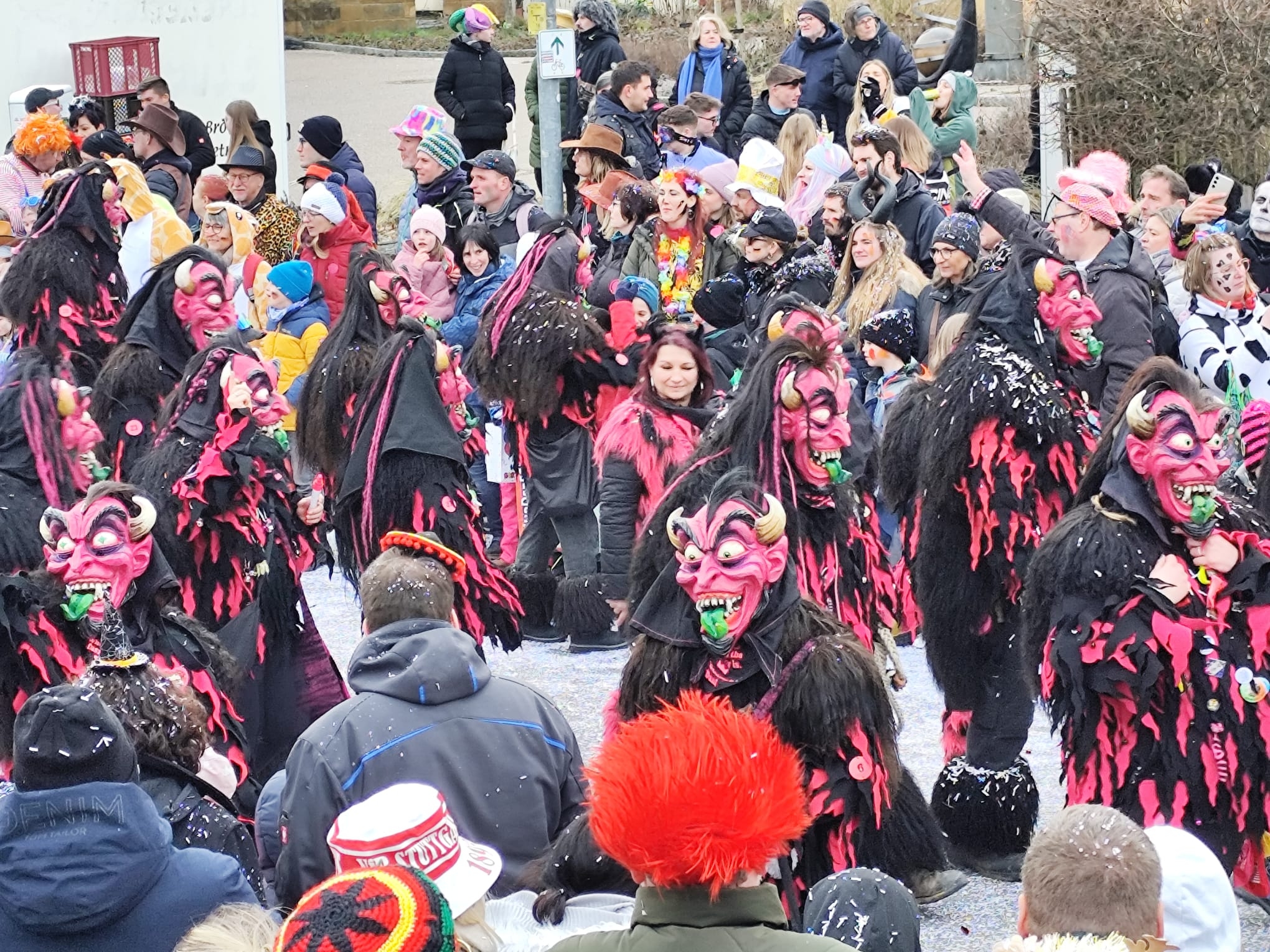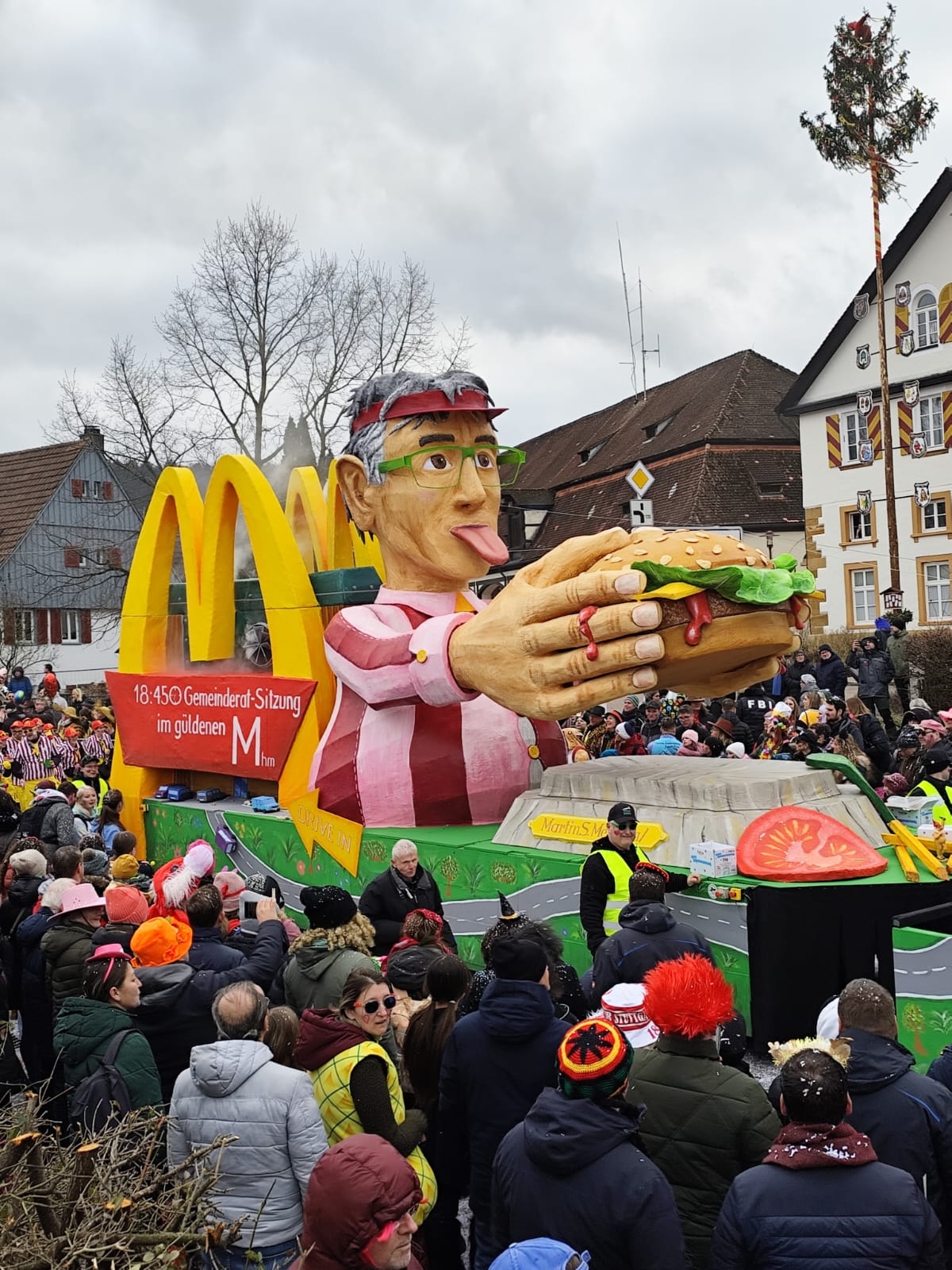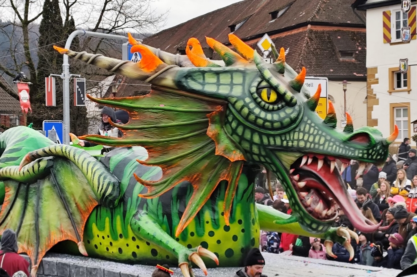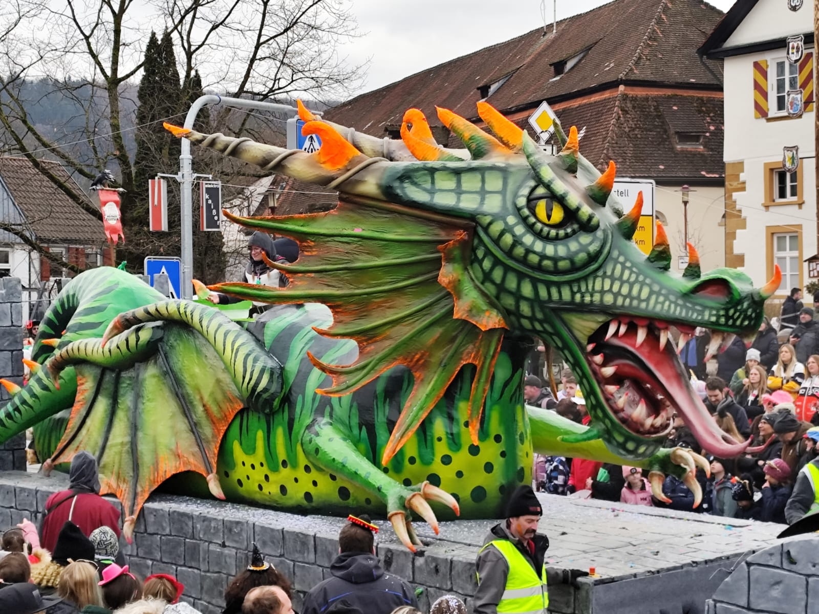À 14h00, le grand défilé a débuté. Malgré le froid, près de 30 000 spectateurs étaient rassemblés pour une commune d’environ 10 000 habitants. Quarante-deux chars et groupes musicaux ont animé le cortège, chacun accompagné de nombreux participants costumés. Les thèmes abordaient l’actualité — parfois avec une pointe de satire à l’égard des responsables publics — toujours dans un esprit festif et bon enfant. Dragons, esprits de la forêt, fous et personnages fantastiques ont offert un spectacle haut en couleur.