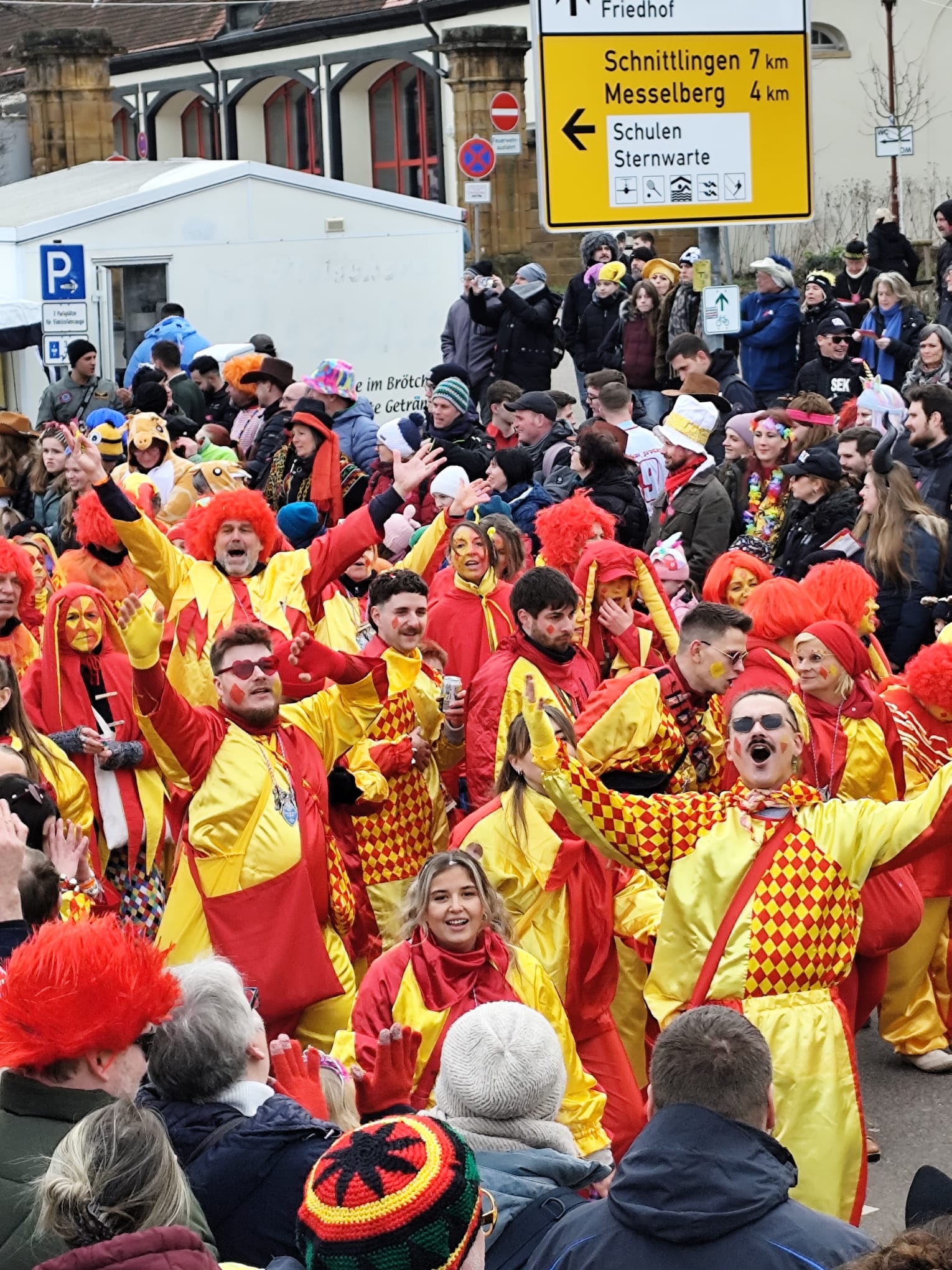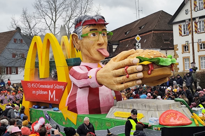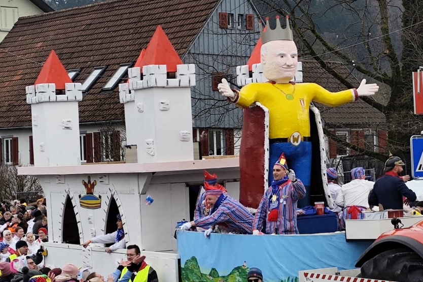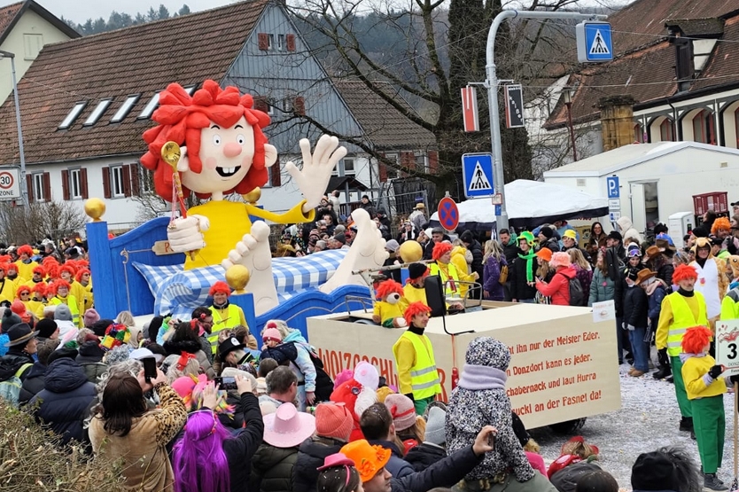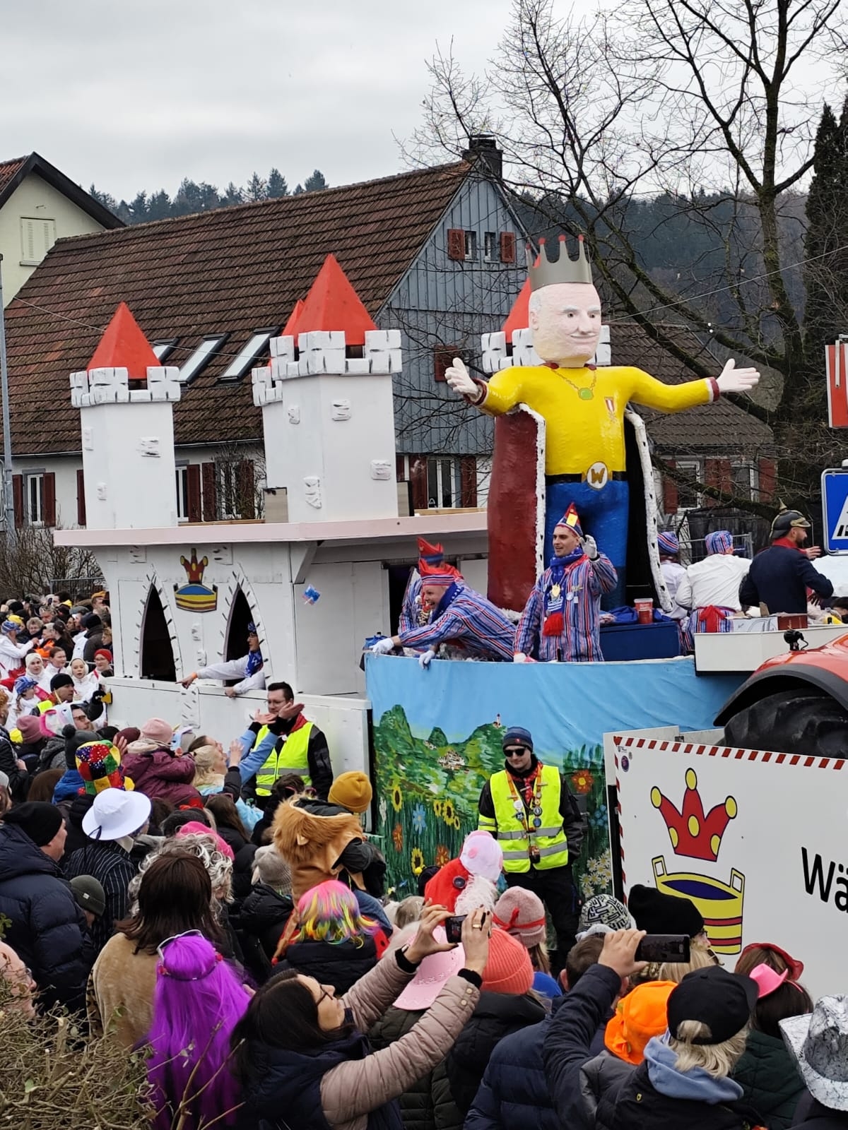 À 14h00, le grand défilé a débuté. Malgré le froid, près de 30 000 spectateurs étaient rassemblés pour une commune d’environ 10 000 habitants. Quarante-deux chars et groupes musicaux ont animé le cortège, chacun accompagné de nombreux participants costumés. Les thèmes abordaient l’actualité — parfois avec une pointe de satire à l’égard des responsables publics — toujours dans un esprit festif et bon enfant. Dragons, esprits de la forêt, fous et personnages fantastiques ont offert un spectacle haut en couleur.