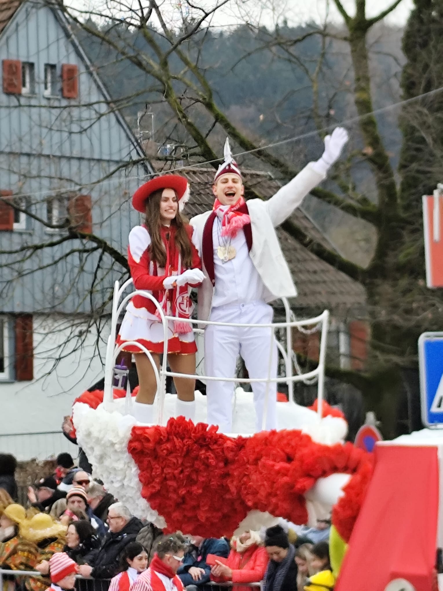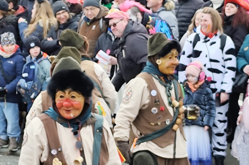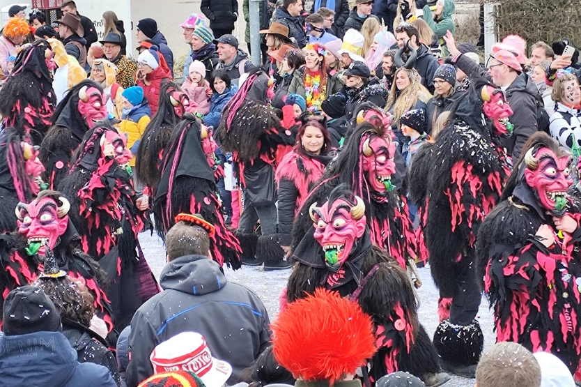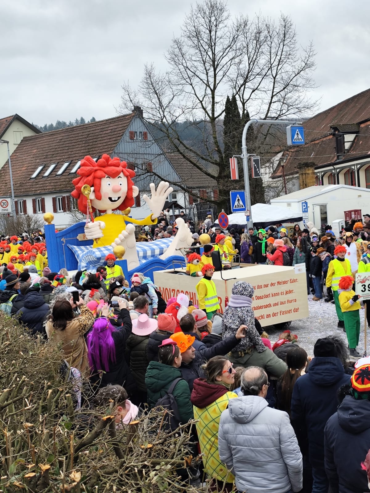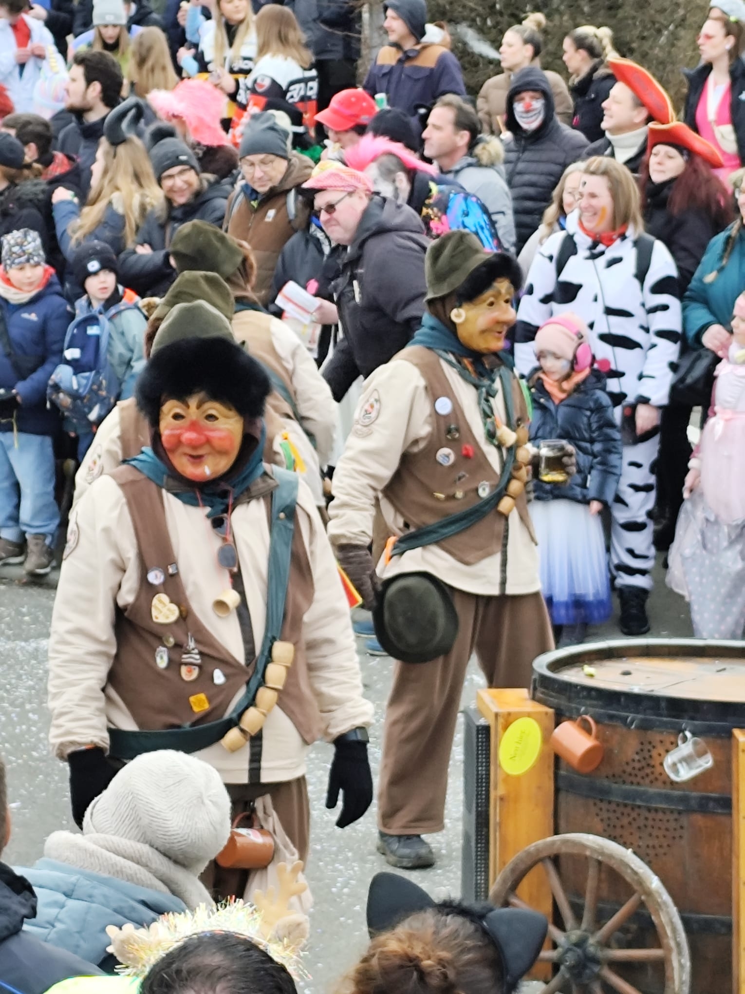 À 14h00, le grand défilé a débuté. Malgré le froid, près de 30 000 spectateurs étaient rassemblés pour une commune d’environ 10 000 habitants. Quarante-deux chars et groupes musicaux ont animé le cortège, chacun accompagné de nombreux participants costumés. Les thèmes abordaient l’actualité — parfois avec une pointe de satire à l’égard des responsables publics — toujours dans un esprit festif et bon enfant. Dragons, esprits de la forêt, fous et personnages fantastiques ont offert un spectacle haut en couleur.