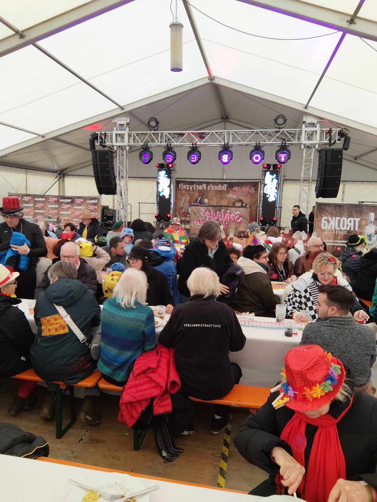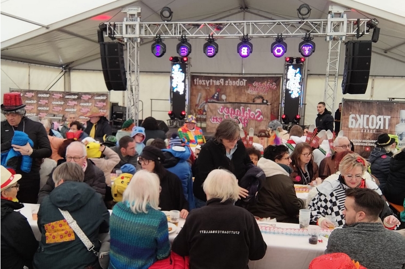 Le dimanche midi, la municipalité de Donzdorf a convié les délégations à un repas sous chapiteau, à proximité du parcours du défilé. Les participants ont pu savourer la spécialité régionale «Linsen mit Spätzle», plat emblématique du terroir souabe.